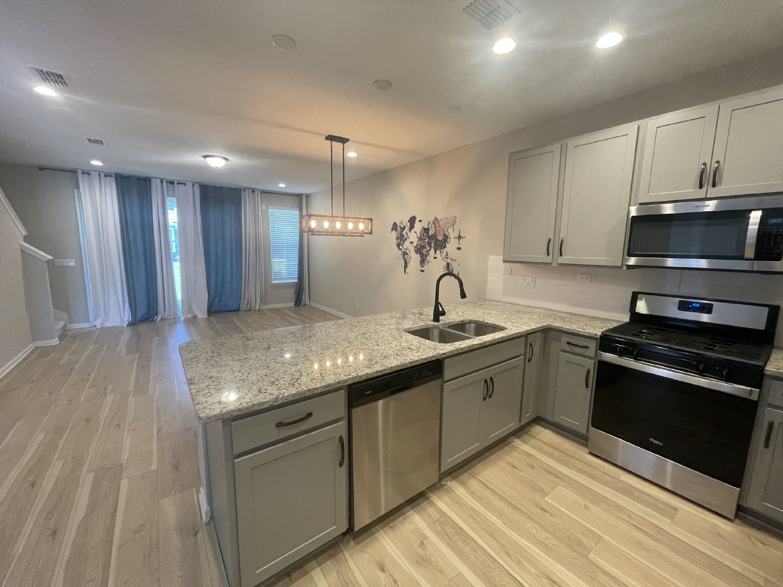This unit has a one car garage, living and dining open to the kitchen. All the bedrooms are upstairs. Kitchen offers extended counter for barstools and plenty of cabinets for storage.